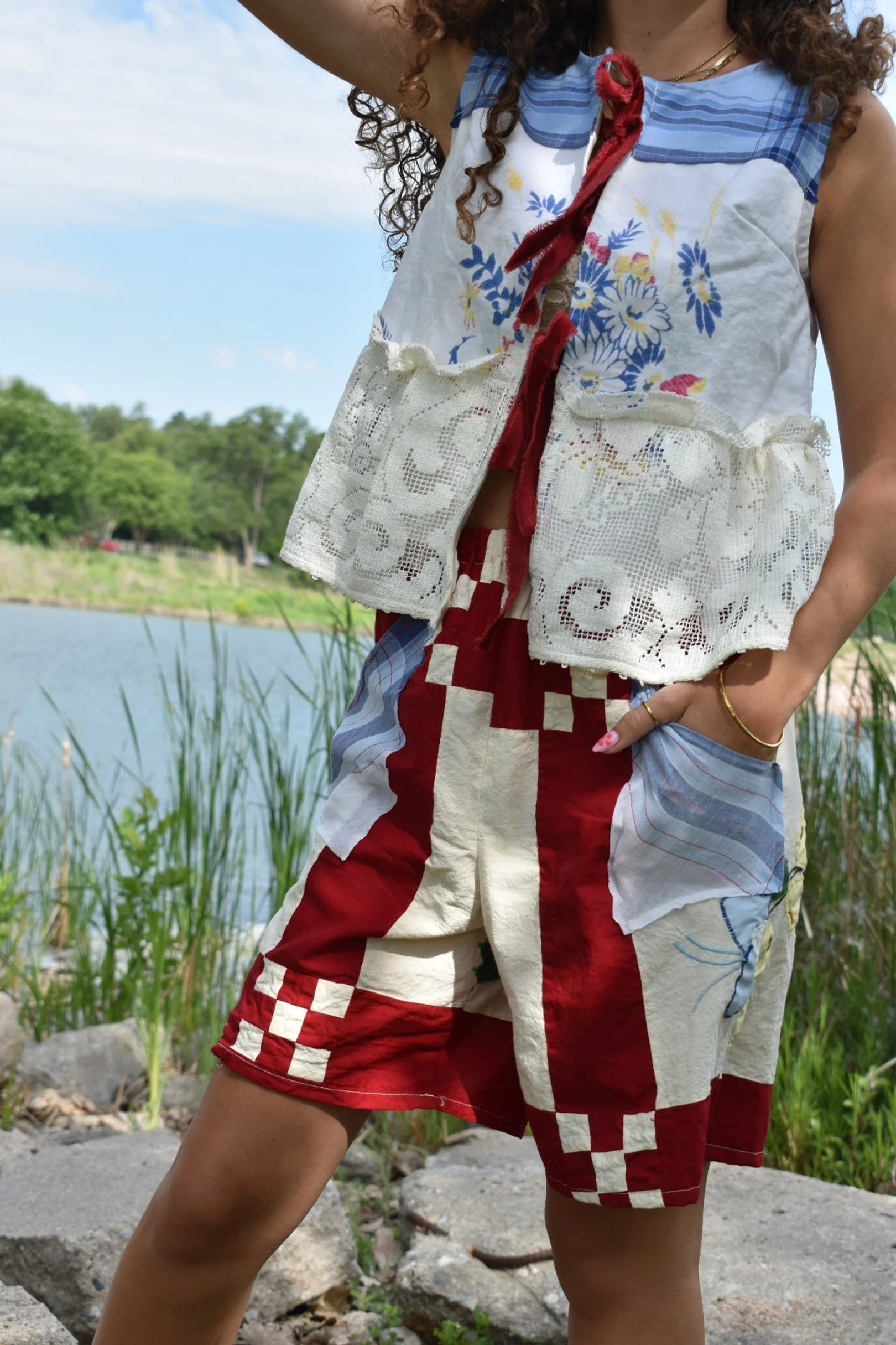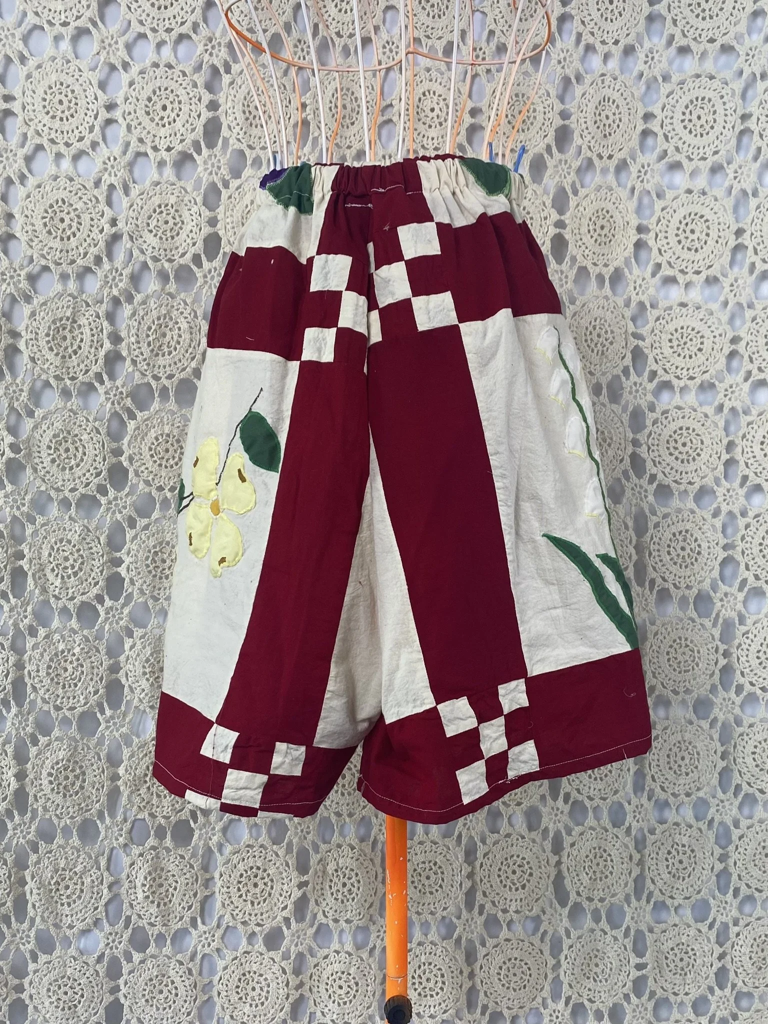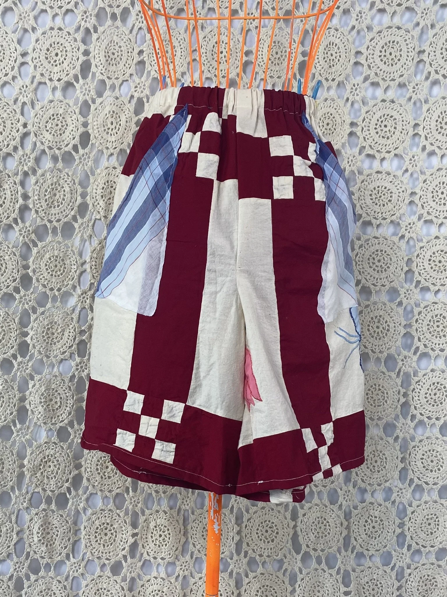 a vintage quilt topper Re-deFind with a vintage hanky for a high-waisted, bermuda short with pockets. would fit size xs to medium
