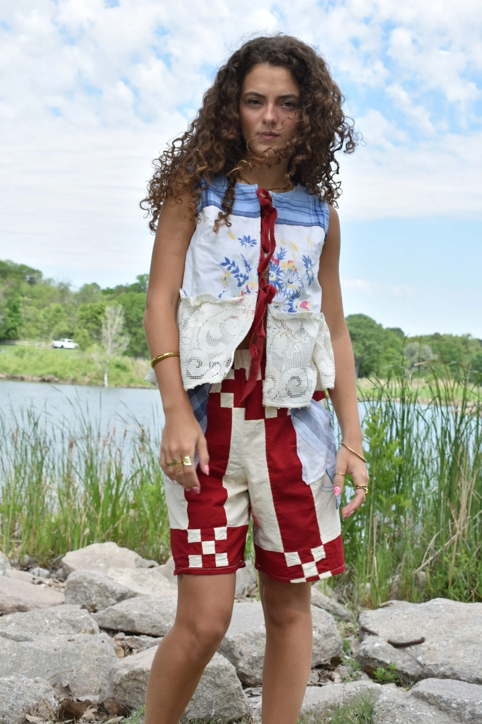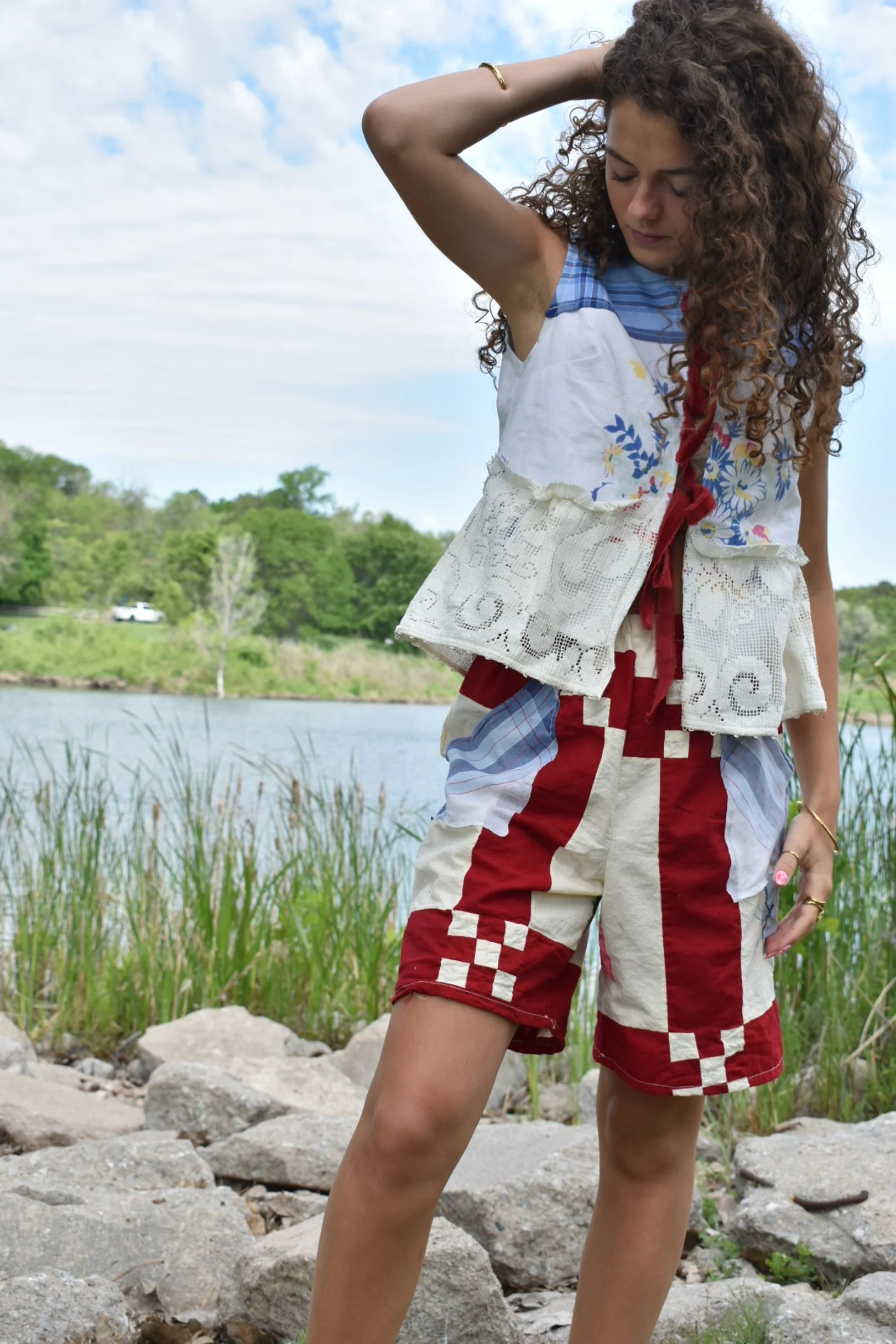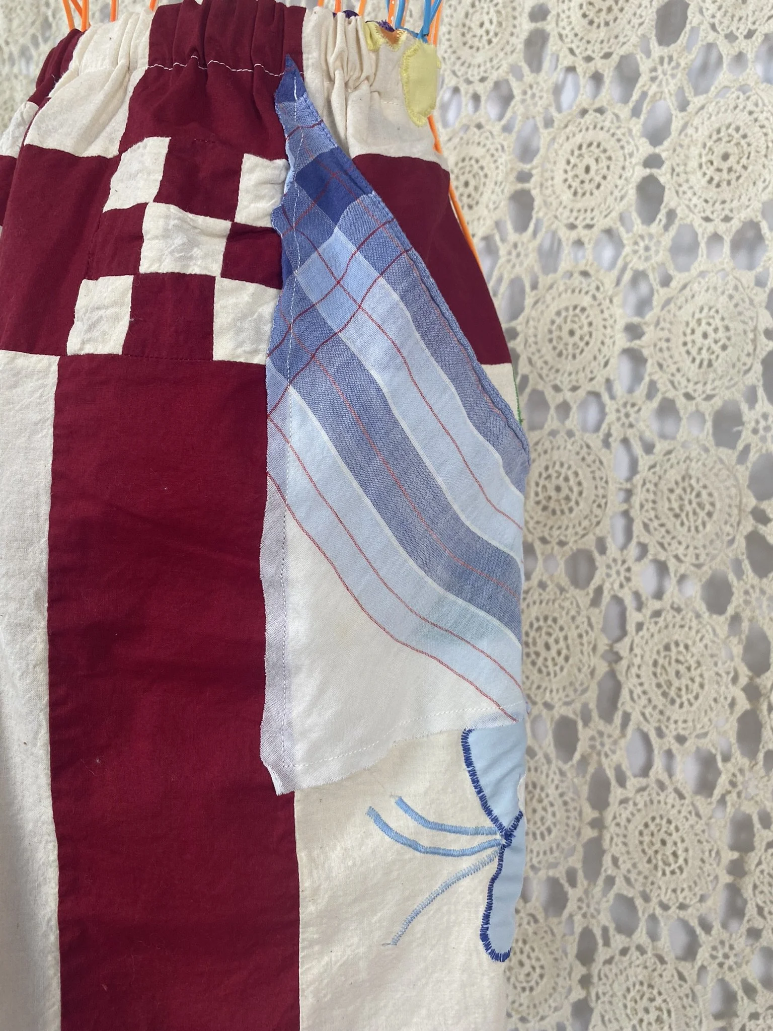 a vintage quilt topper Re-deFind with a vintage hanky for a high-waisted, bermuda short with pockets. would fit size xs to medium