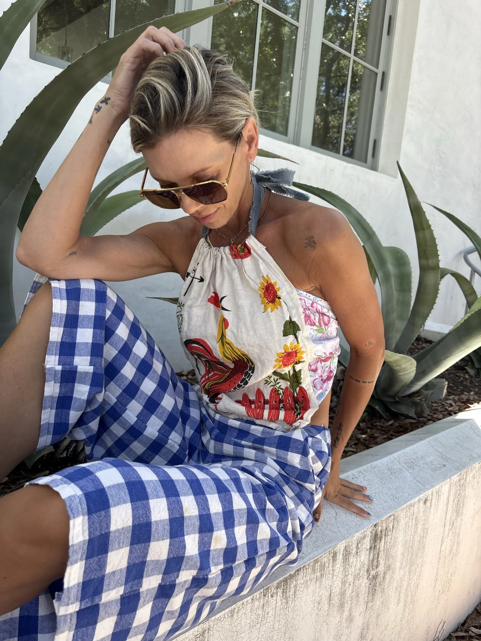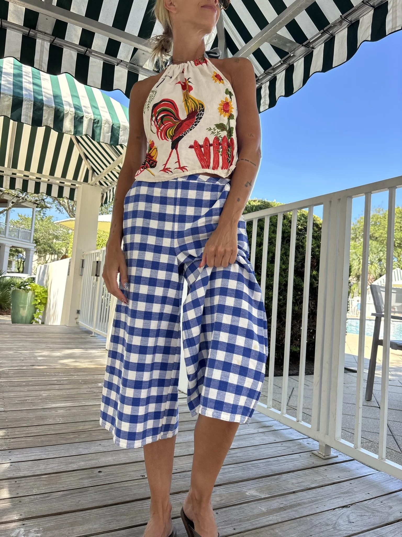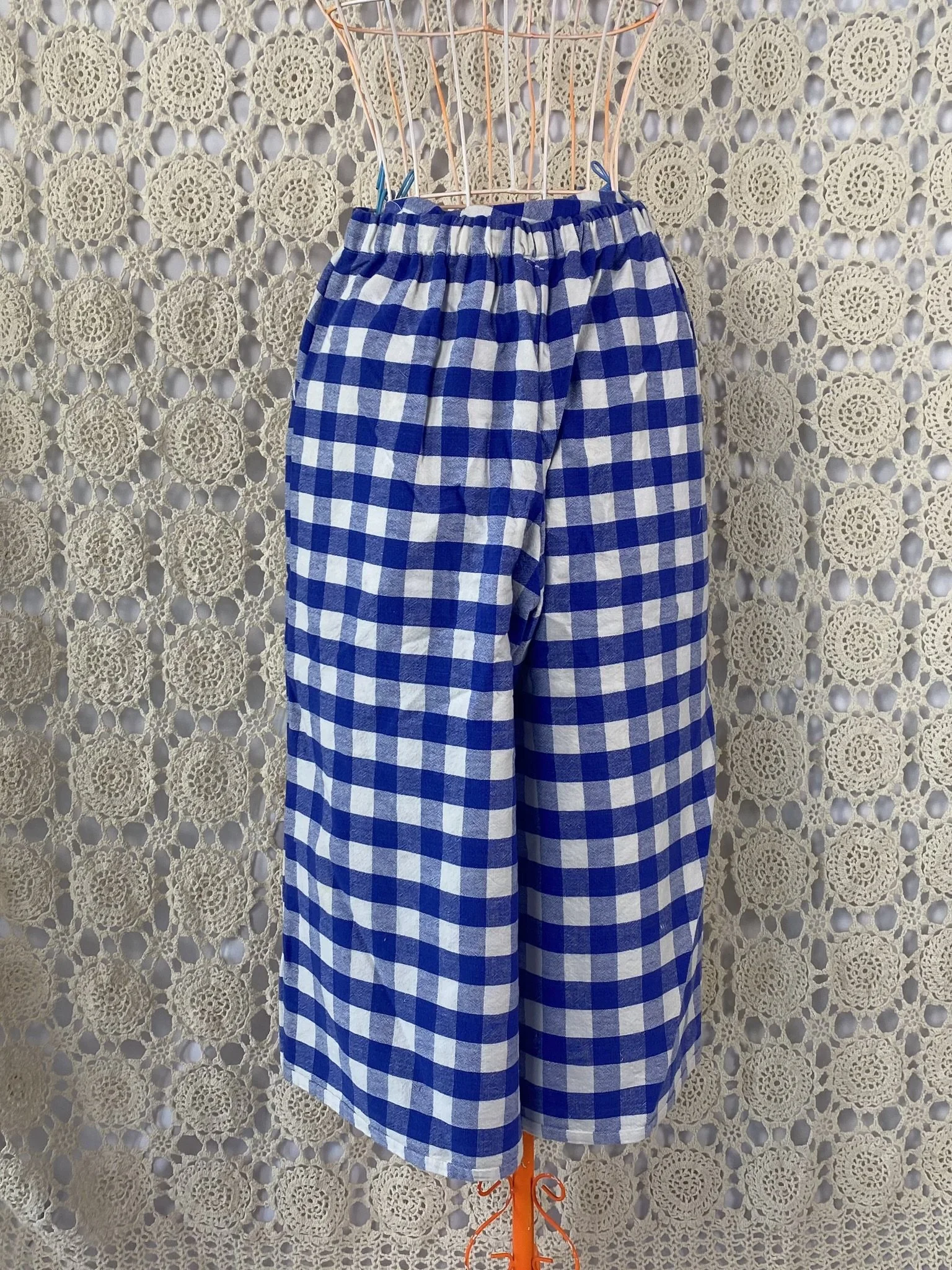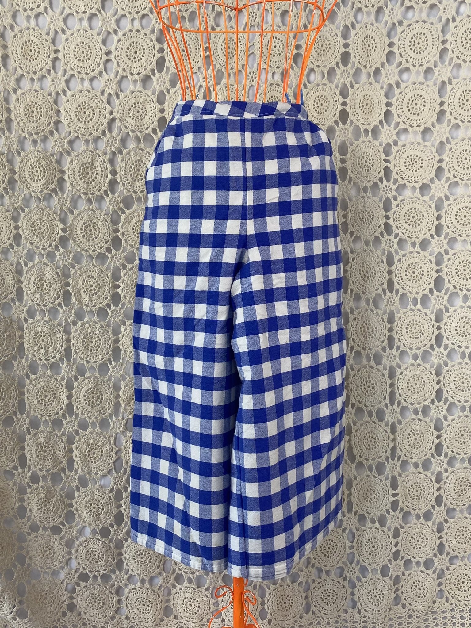 a vintage tablecloth Re-deFind into a flat front gaucho pant (with pockets!!!!) elastic back waist allows for sizes xs to medium